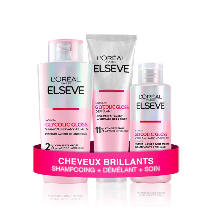 Content: 1x Complete Hair Routine 3 L'Oréal Paris products Elseve Glycolic Gloss, Included: 1x Sulfate-Free Shampoo (200 ml), 1x Detangling Gloss (150 ml), 1x Lamination Care (200 ml)