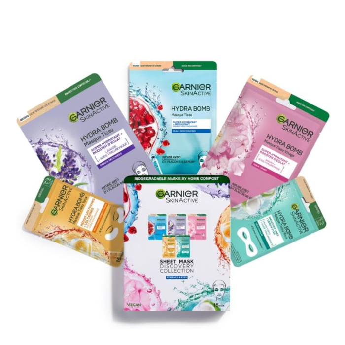 5 MASKS FACE AND EYES FABRIC: Need to take care of your skin? Discover this batch of Garnier masks (3 for the face and 2 for the eyes) with hyaluronic acid associated with pomegranate, lavender, coconut water, sakura or orange.