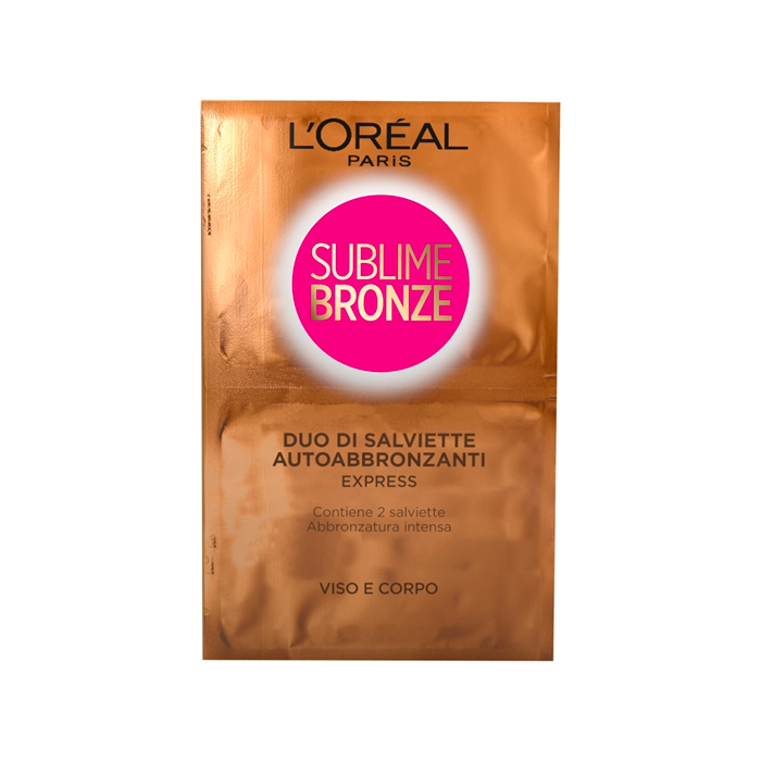 A twin pack of L'Oreal Sublime Self-Tan Wipes Face and Body, an express and ultra-easy application for a 100 per cent natural-looking, golden tan. Express application, a practical solution: the wipe slides over the skin and distributes an even amount of product, without streaks, even on those difficult to reach areas (behind the knees, around the ankles) You can use a double sachet with 2 wipes in one application if you want an all over tan (face-chest-arms-legs), or only 1 wipe for application on the face, chest, arms or for an application on the legs only. Sublime Bronze, with Pro-AHA, smoothens the skin and provides an even, natural-looking tan. The wipes contain a high level of self-tanning agent to provide a golden and natural-looking tan from the first application. Ambient type storage.