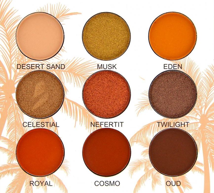 Palette of 9 eyeshadows: 5 matte shades and 4 glittery shades, colors ranging from light beige to brown to copper.